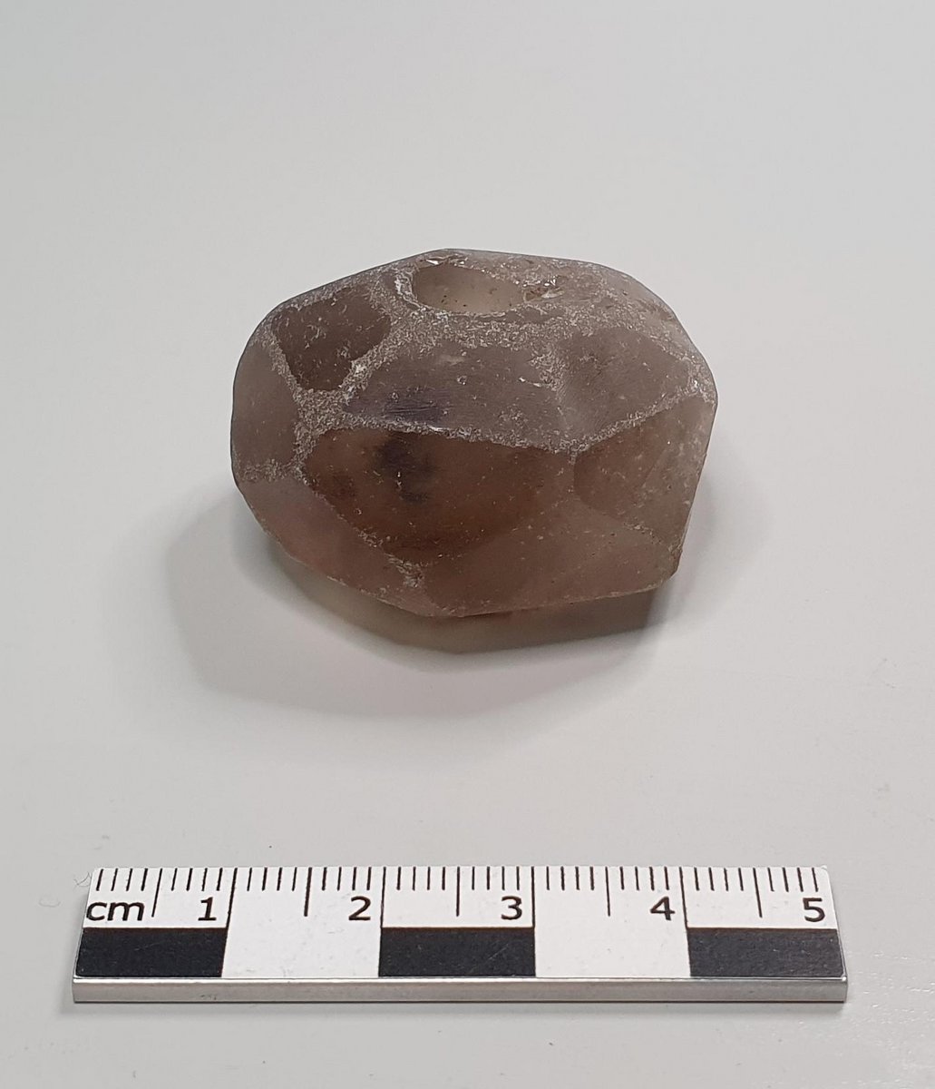 Dieser durchlochte, gedrückt-kugelige Anhänger misst 3,5 cm im Durchmesser und besteht aus Bergkristall oder genauer: aus Rauchquarz. Rauchquarz ist durch natürliche Radioaktivität bräunlich-violett gefärbter Quarz – wie in unserem Fall – während Bergkristall einen komplett farblosen, reinen Quarz meint. Gefunden wurde das feine Stück Anfang Juni in einem Frauengrab unter der Münchner Straße. Es war Teil eines so genannten Amulettgehänges, dass Frauen im 6. und frühen 7. Jahrhundert trugen. Ausgehend von einem Gürtel hingen hier an einem Lederband unterschiedliche Objekte mit symbolischer Bedeutung. Unter anderem eben dieser feine Rauchquarzanhänger. Ein reines Schmuckobjekt war dieser facettiert geschliffene Anhänger wohl weniger, vielmehr handelte es sich um ein Amulett. Was genau man mit ihm im frühen Mittelalter verband, wissen wir nicht. In späterer Zeit stand Bergkristall symbolisch für versteinertes Eis und man sagte ihm kühlende und lindernde Wirkung bei Fieberkrankheiten nach. Solch geschliffene Kristallobjekte sind eher selten. Das Grab gehörte zu dem großen Gräberfeld am Bajuwarenring mit über 450 Gräbern. Hier fanden sich nur zwei weitere Amulette aus Bergkristall oder Rauchquarz. Es handelt sich um einen besonderen Fund, der nach der Restaurierung des restlichen Grabinventars in die Ausstellung des AschheiMuseum kommt!