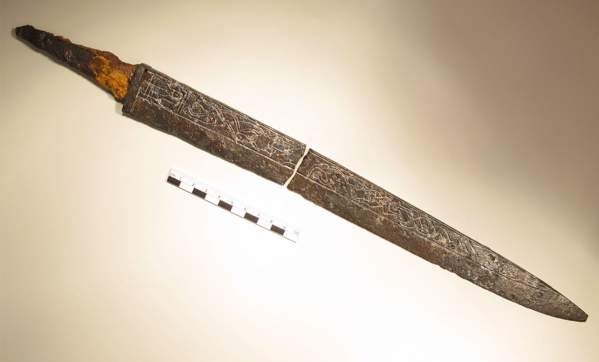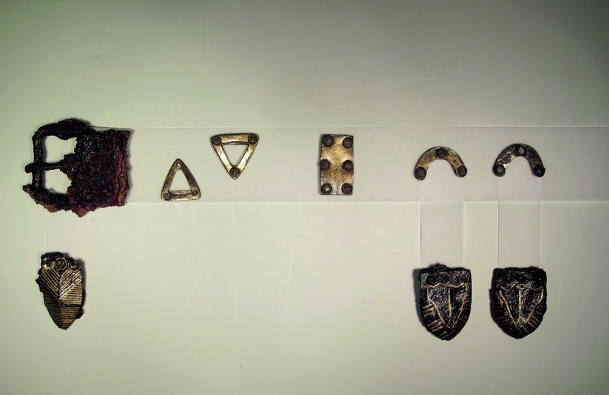 Einen solchen Gürtel der zweiten Hälfte des 7. Jahrhunderts fand man bei Ausgrabungen im Jahr 1986 an der heutigen Saturnstraße in Aschheim. Das heißt, vom Leder war nicht mehr viel übrig, eigentlich fand man nur noch die Beschläge aus Eisen. Der Gürtel lag nicht in einem Grab, sondern vermutlich gut verpackt in der Verfüllung eines Grubenhauses. Von seiner Verpackung haben sich durch den Rost der eisernen Beschläge Reste unterschiedlich feinen Textils und Federn erhalten, die sich durch die braunen Auflagerungen erkennen lassen. Die Beschläge sind durch silberne Tauschierarbeiten verziert. Die Muster zeigen zeittypischen Tierstil – fast floral gewundene Tierkörper, die ineinander beißen. Eigentlich wunderschöne Stücke, nur leider hat der Zahn der Zeit und eine lange unsachgemäße Aufbewahrung das Eisen stark mitgenommen, weshalb die Beschläge nicht mehr alle in voller Pracht erhalten sind.