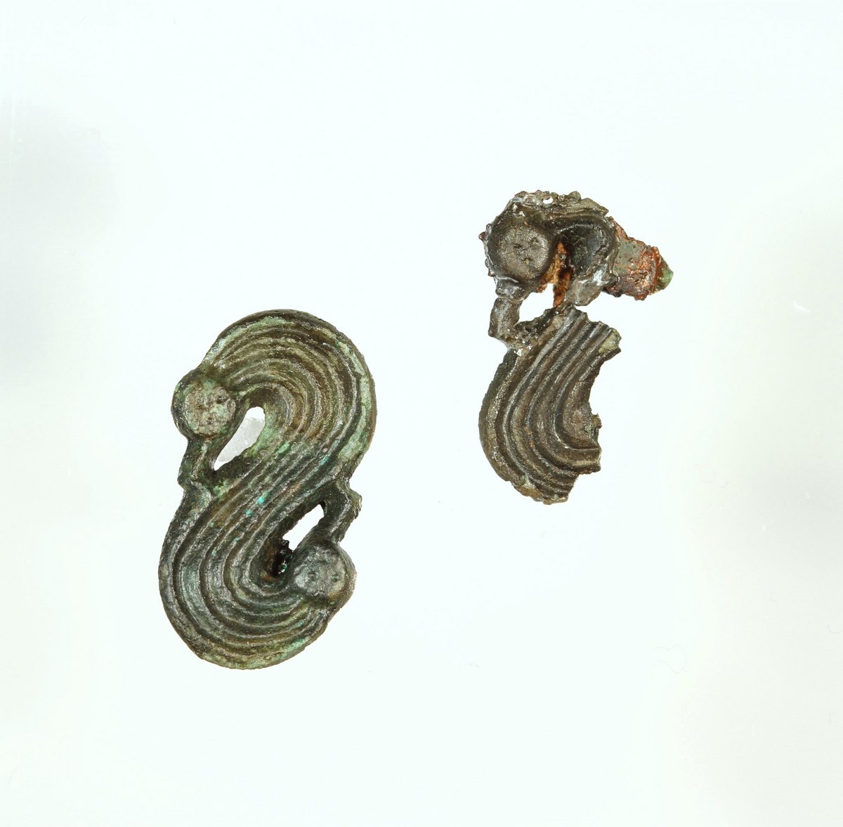 So etwa diese beiden S-förmig geschwungenen Silberfibeln. Sie sind von einer einfachen und relativ frühen Form. An den sich verjüngenden Enden sitzen kleine Kreise, von denen gebogene Schnäbel abgehen. Die Kreise deuten Köpfe sowie Augen an. Gemeinsam mit den Schnäbeln ergeben sich zwei gegenständig zueinander gedrehte Vogelformen. Paarig wurden solche Fibeln wie Broschen von Frauen zum Verschluss eines Kleides im Brustbereich getragen. Diese Fibeln aber fanden sich in der Gürteltasche eines Männergrabes und der Mann starb gut 30 Jahre nachdem sie aus der Mode waren. Dennoch klemmten zwischen den Befestigungsnadeln der beiden Fibeln Textilreste. Hatte hier jemand vielleicht den elterlichen Schmuck bewahrt, in ein Stück Stoff eingeschlagen und bei sich getragen? Möglicherweise waren die etwas abgetragenen Schmuckstücke auch nur zum Einschmelzen des Silbers gedacht gewesen.