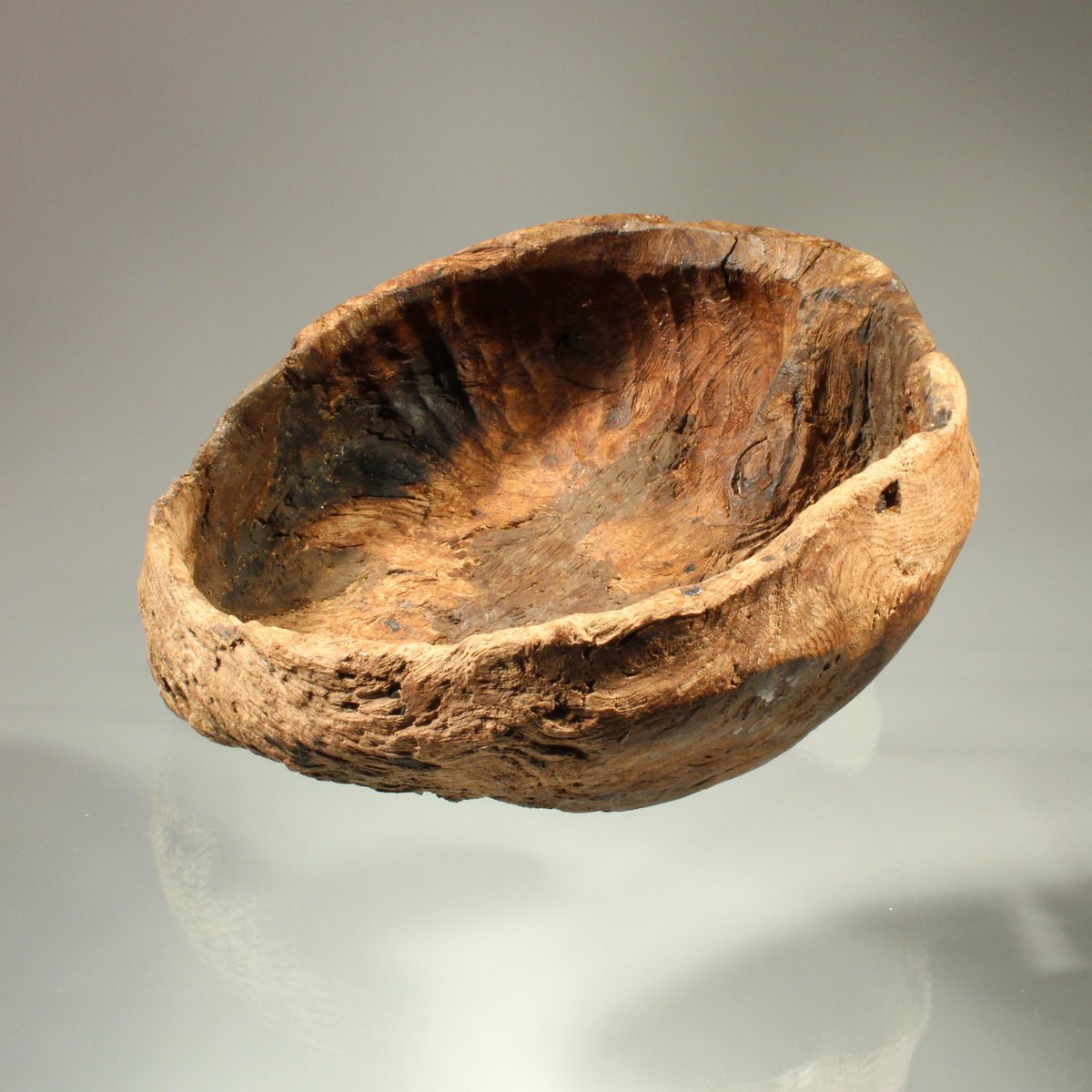 Diese Schale muss einmal wunderbar ausgesehen haben. Ihre Grundform wurde vermutlich gedrechselt, doch innen war sie von Hand ausgenommen worden. Deutlich sieht man die Kehlen des gekröpften Schnitzeisens. Es handelt sich um ein ringpooriges, hartes Laubholz aus dem Wurzelbereich, möglicherweise einer Eiche.