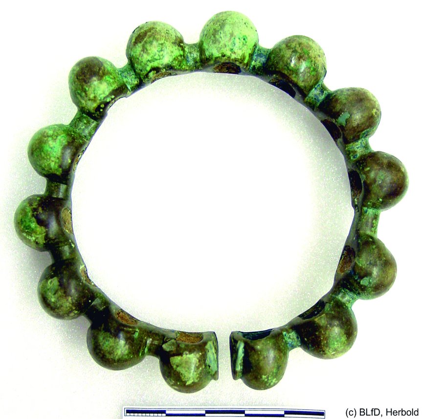 Einige der in Aschheim und Dornach damals lebenden Kelten stammten nicht von hier. Vielleicht auch diese Dame nicht. Während der dickere Ring in dieser Gestaltung häufiger zu finden ist, zeigt der dünne, aufgrund der Verzierung „Warzenring“ genannte Typ, eine Häufung in Böhmen und Mähren. Naturwissenschaftliche Analysen an Skeletten derselben Zeit aus Dornach konnten zeigen, dass etwa die Hälfte der Menschen nicht dort aufgewachsen war. Aufgrund der archäologischen Funde dürften sie aus dem Böhmisch-Mährischen Raum stammen. Was die Menschen damals dazu brachte, ihre Heimat zu verlassen und in anderen Gebieten Fuß zu fassen, wissen wir nicht. Allerdings waren die Dornacher keine Einzelerscheinung: etwa ab 380 v. Chr. setzt eine Migrationsbewegung ein, die wir heute die „keltischen Wanderungen“ nennen. Eine mögliche Erklärung könnte eine einsetzende Klimaveränderung gewesen sein.