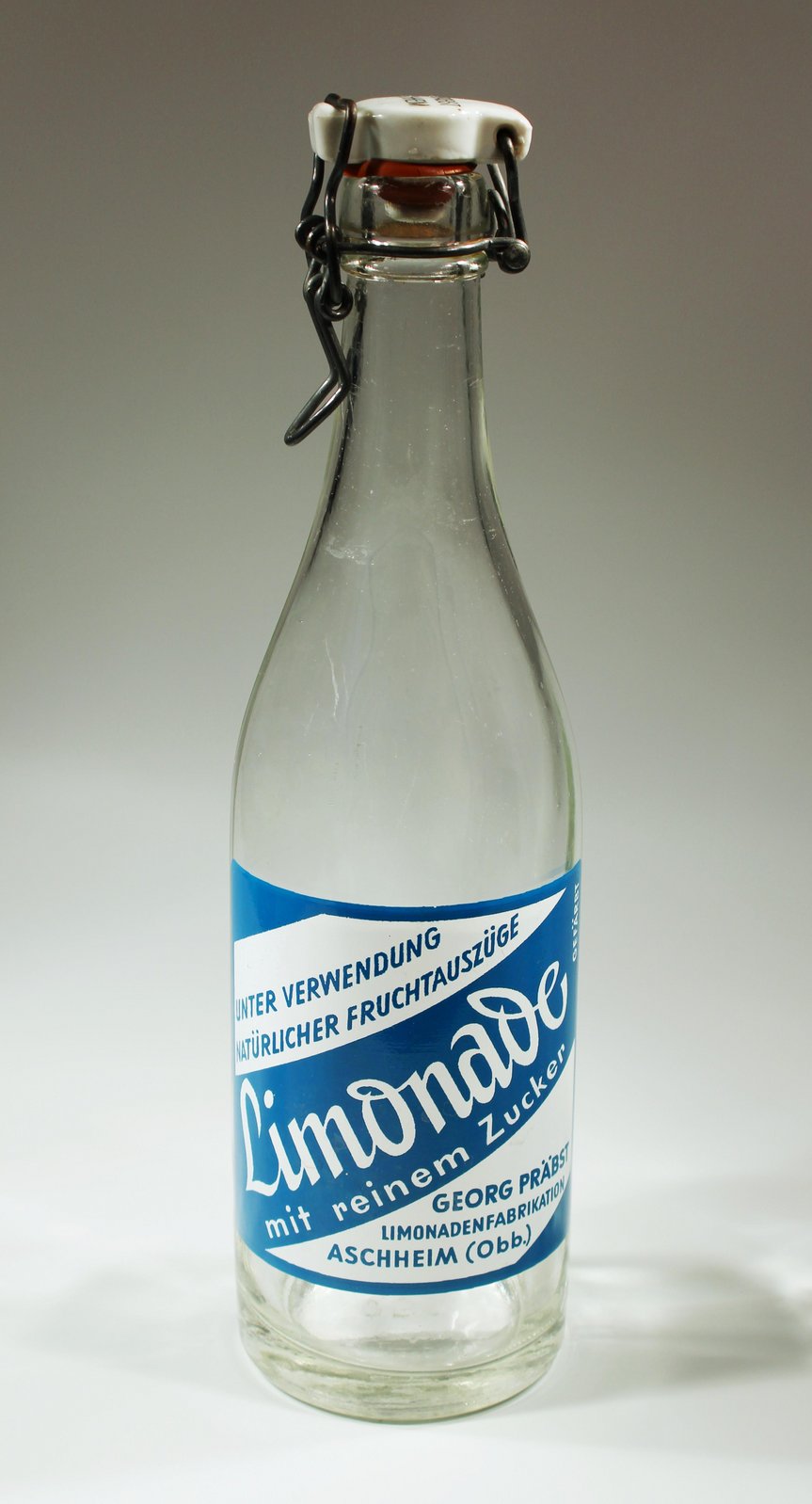 In der Nachkriegszeit, als sich bedingt durch Zerstörungen, Neuaufbau und den industriellen Wandel im bisherigen Agrarland Bayern so einiges änderte, suchten viele nach neuen Arbeits- und Auskommens Möglichkeiten. So auch der Aschheimer Georg Präbst, der 1954 in der Tassilostraße eine Limonadenfabrikation ins Leben rief. Limonade war nach dem Krieg sehr beliebt geworden, das süße Getränk stand ein Stück weit für das neue Leben im Wiederaufbau. So erfreute sich denn auch die Aschheimer Limonade einer großen Beliebtheit. Sieht man sich das Etikett der Flasche genau an, so fällt der Schriftzug „mit reinen Zucker“ auf. In Zeiten, in denen Cola Zero und andere, möglichst zuckerfreie Getränke mit dennoch vollem Geschmack werben, wirkt das herausstellen der vollen Zuckersüße etwas befremdlich. Es war eine andere Zeit, Zucker viel seltener und etwas Besonderes.