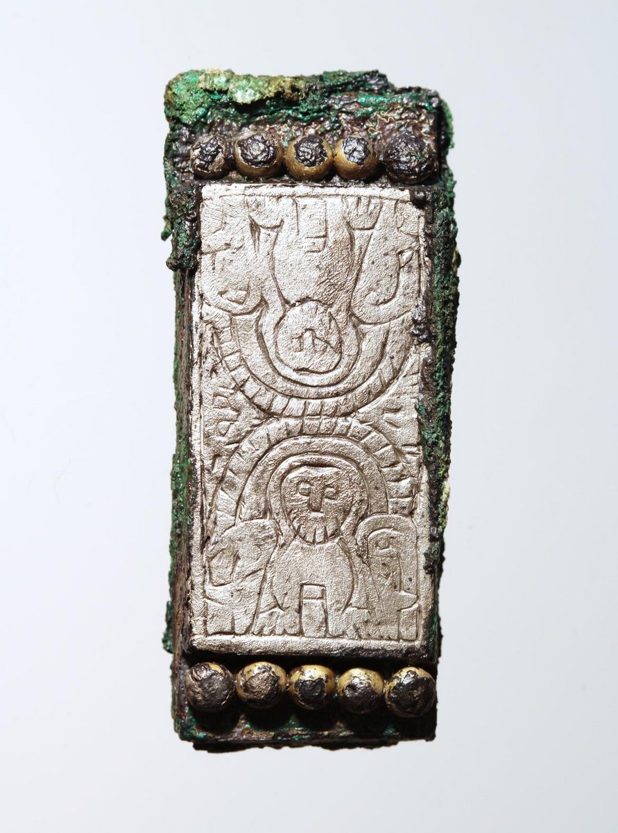 Siebenundzwanzig Jahre lang befand sich dieser Beschlag einer Schwertaufhängung von einer Patina überzogen im Lager des AschheiMuseums. Er stammt aus einem Männergrab, das 1998 am heutigen Bajuwarenring ausgegraben worden war. Ein Teil bisher lediglich konservierter Funde wurde dieses Jahr restauriert und dabei gab der Beschlag sein Geheimnis preis: Die Vorderseite trägt die Darstellung einer Gestalt mit menschlichem, bärtigem Kopf, umgeben von einem schlangenartigen Wesen mit Eberkopfenden, die sich gespiegelt zweimal zeigt. Auch wenn die Darstellung etwas grob ausgeführt wurde, ist sie doch hochspannend. Denn ähnliche Motive kennen wir häufiger, auch in etwas besser erkennbarer Ausführung. Es dürfte sich dabei um einen thronenden Christus handeln, der durch die umgebenden Tiere als Zähmer oder Herrscher über wilde Kreaturen portraitiert wird. Die Darstellung von Christus als Sieghelfer oder starkem Gott ist im frühen Mittelalter, als die Menschen in Süddeutschland vom Christentum erst noch überzeugt werden mussten, ein sehr beliebtes Motiv. Auf diesem Beschlag aus der Zeit um 600, zeigt es das früheste Zeugnis bewusst christlicher Motivik und möglicherweise auch christlichen Verständnisses, das wir aus Aschheim kennen. Es muss jedoch bereits mehr Christen gegeben haben – denn kurz nach 600 wurde die erste Kirche gebaut.