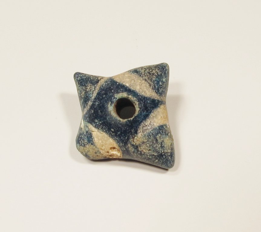Es handelt sich um einen Grundkörper aus Glas, auf den kleine, viereckige Glasplättchen mit spezifischen Mustern, richtig angeordnet, aufgeschmolzen wurden. Vorher müssen die Glasplättchen mit den Mustern vierblättriger gelber Blüten in grünem Glas und weiß-roter Ringe in blauem Glas aus Glasmasse hergestellt werden. Zusammengenommen eine Meisterarbeit, die nicht jeder Glasperlenmacher beherrschte. Dieser Wirtel stammt wohl auch gar nicht aus Süddeutschland, sondern viel eher aus Italien. Aufgrund der Blütenmuster nennt man es Millefioriglas - Glas aus tausend Blüten!